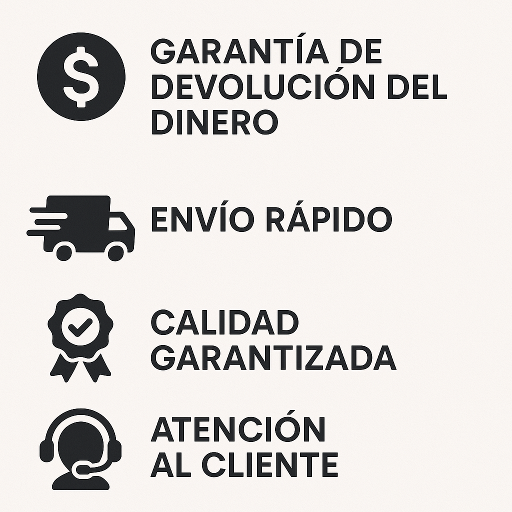 ESTAMOS COMPROMETIDOS CON LA CALIDAD DE NUESTROS PRODUCTOS, SI NO COMPLETAMENTE SATISFECHO CON TU COMPRA, DEVUELVELO DENTRO DE LOS 90 DIAS Y RECIBIRAS UN REEMBOLSO COMPLETO. TU SATISFACCION ES NUESTRA PRIORIDAD.